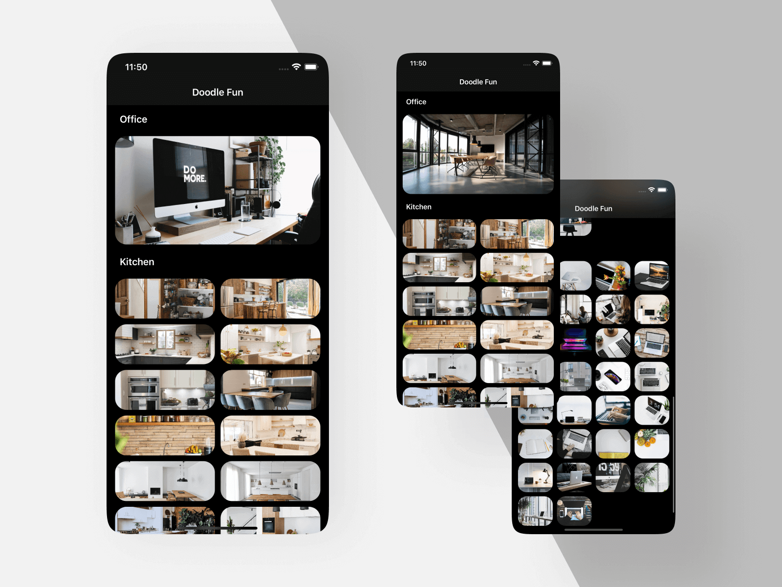 Now run the app to have a test. Your app should show three different grids for each section.